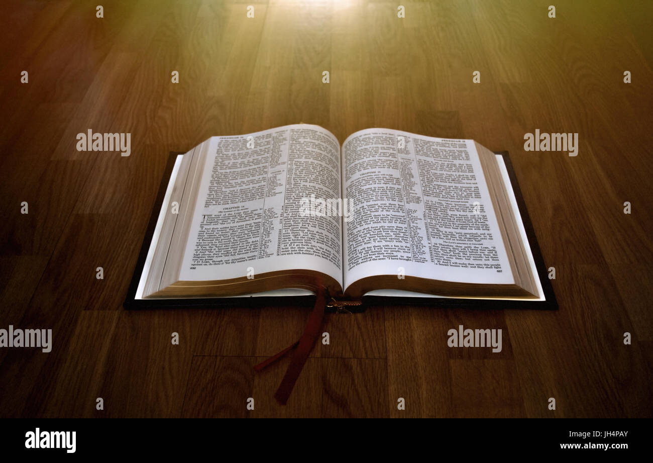 La Santa Bibbia Aperta Su Sfondo Di Legno Con Luce D Accento Foto Stock Alamy