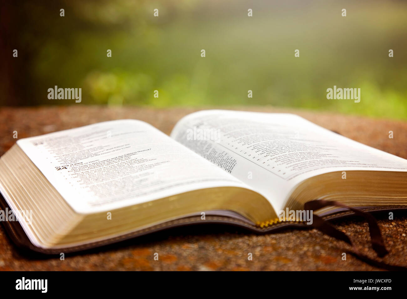 Una Bibbia Aperta Su Un Tavolo In Un Giardino Verde Foto Stock Alamy