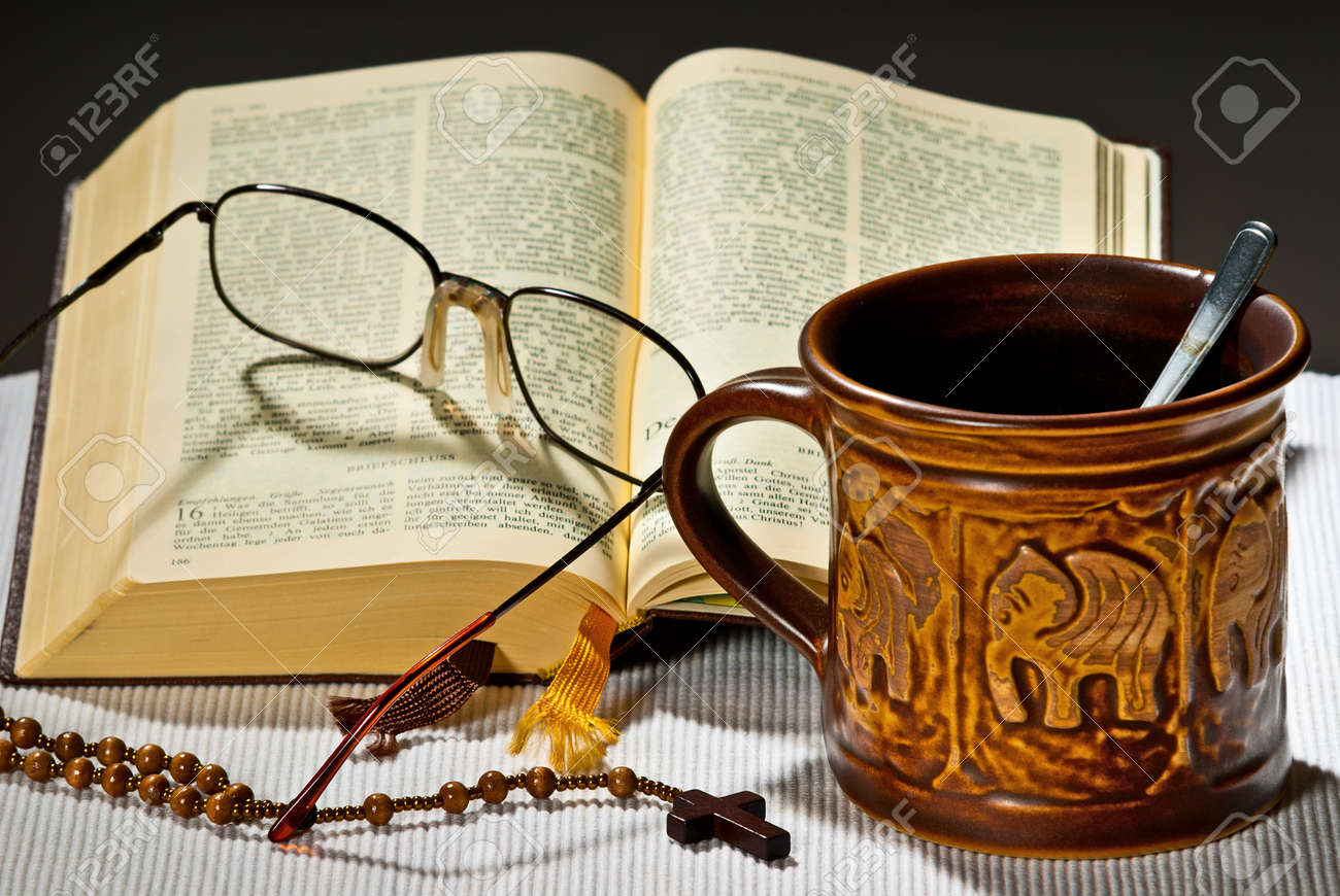 Immagini Stock Ancora Vita Con La Tazza Di Te E Bibbia Aperta Image 58889274