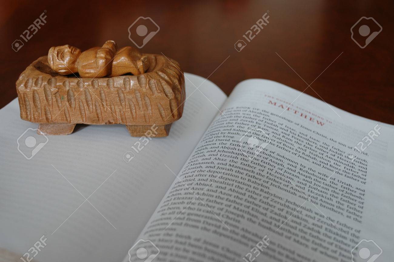Immagini Stock Bibbia Aperta A Matteo Con Il Bambino Gesu Nella Mangiatoia Image 71241507