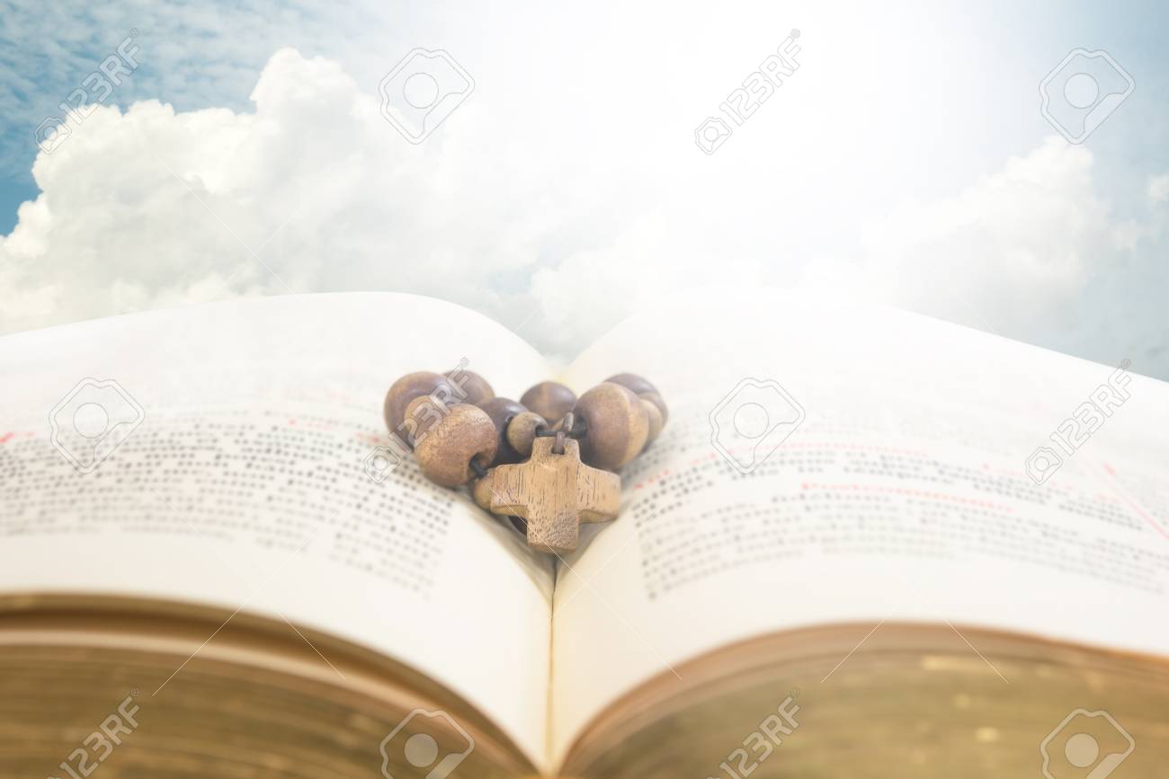 Immagini Stock Traversa Del Rosario Che Riposa Contro La Bibbia Aperta Con La Priorita Bassa Del Cielo Image 38977840