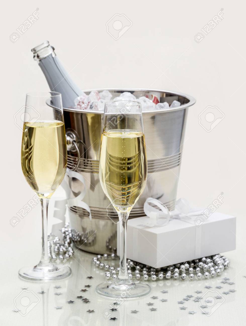 Immagini Stock Due Bicchieri Di Champagne Piu Fresco E Regalo Elegante Oscurati Image 65089956