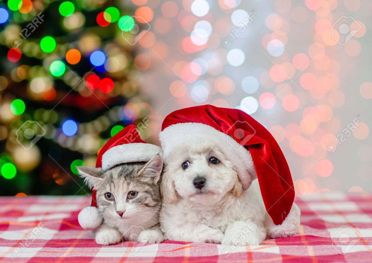 Immagini Stock Cucciolo E Gattino Di Bichon Frise In Cappelli Rossi Della Santa Su Una Priorita Bassa Dell Albero Di Natale Image 93334442