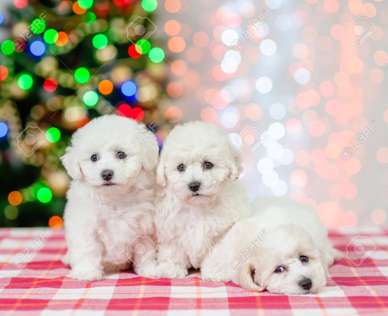 Immagini Stock Gruppo Di Cuccioli Di Un Bichon Frise Su Una Priorita Bassa Dell Albero Di Natale Image 94596201
