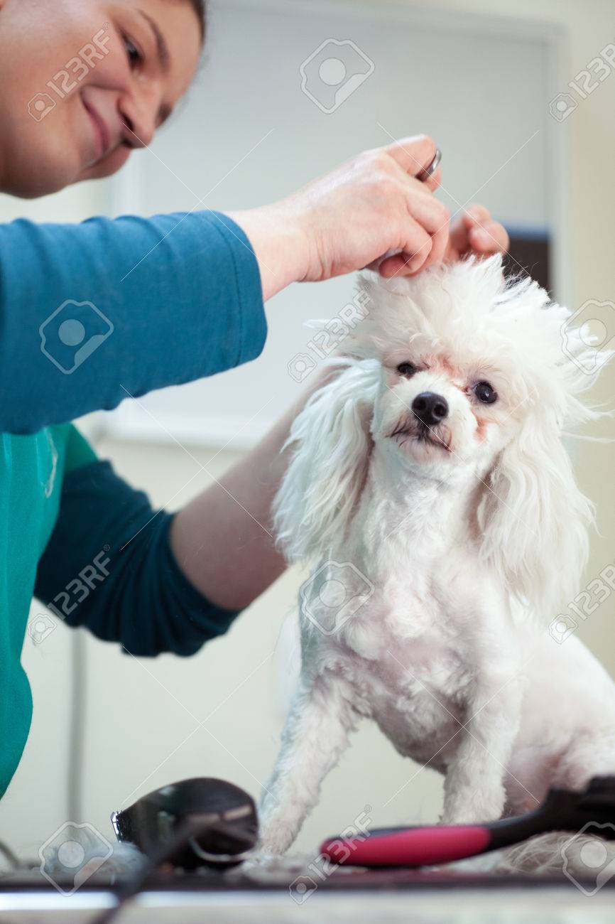 Immagini Stock Cane Bianco Bichon Frise Che E Curato Da Un Funzione Professionale Image 75163498