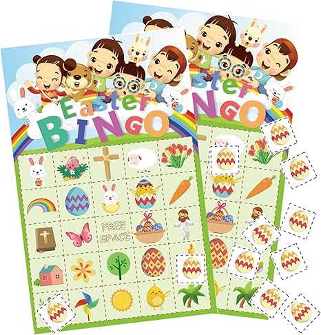 Amazon Com Easter Bingo Game For Kids Party Cards Bunny Egg Hunt Activity 24 Players Kitchen Dining