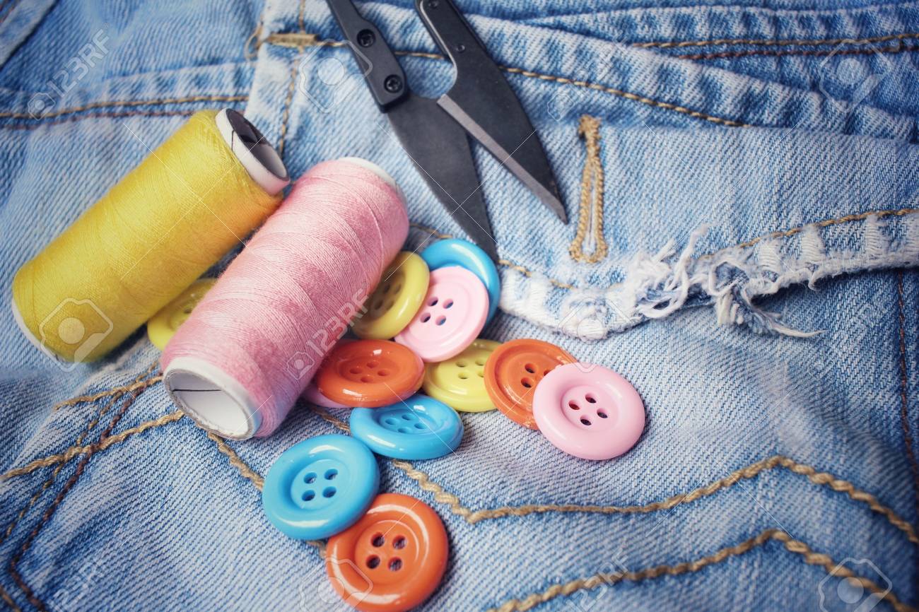 Immagini Stock Bottoni Colorati Per Cucire Forbici E Filo Su Jeans Image 43101033