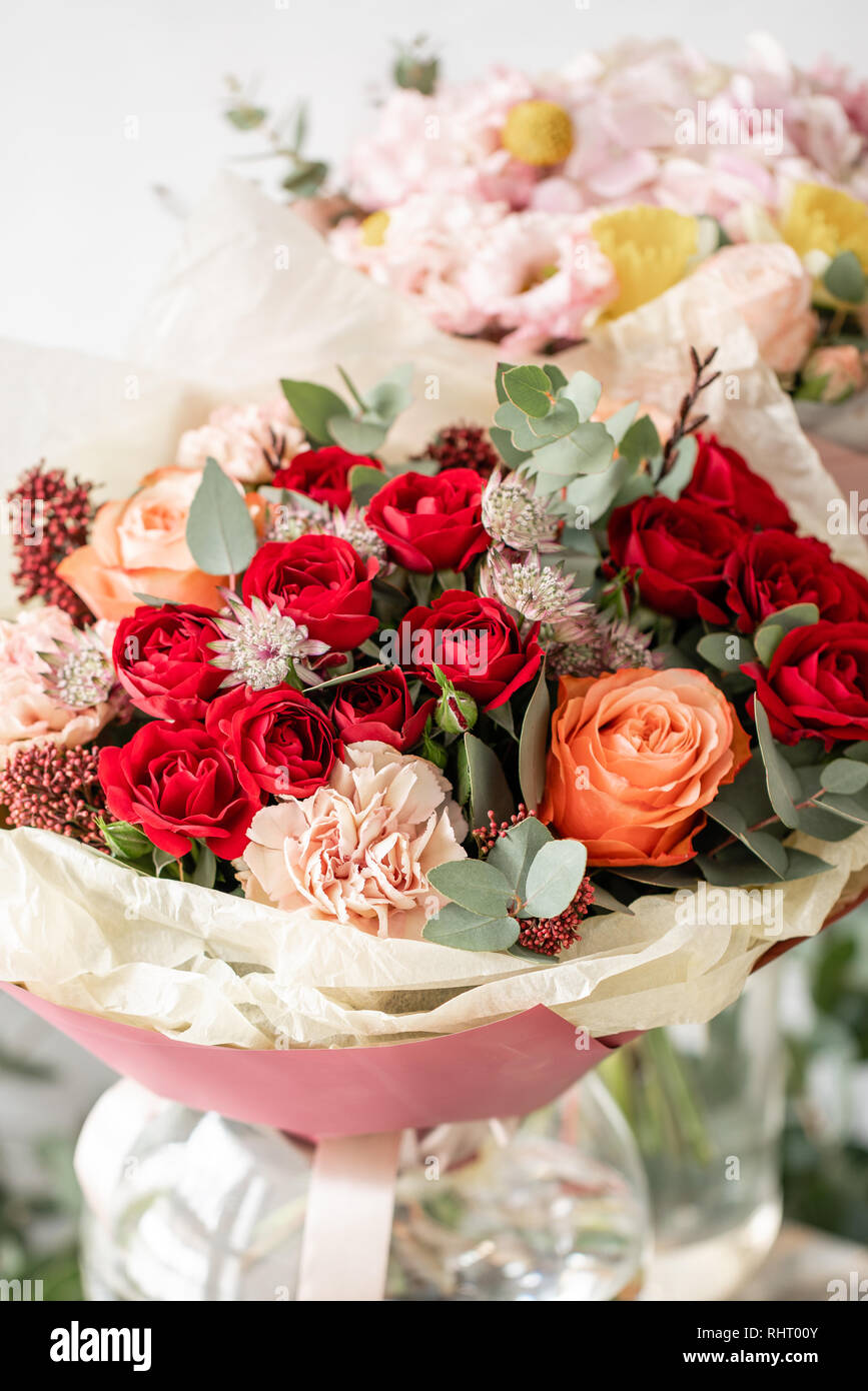 Two Beautiful Fresh Cut Bouquet Of Mixed Flowers In Vase On Wooden Table The Work Of The Florist At A Flower Shop Red Spray Roses And Other Flowers Stock Photo Alamy