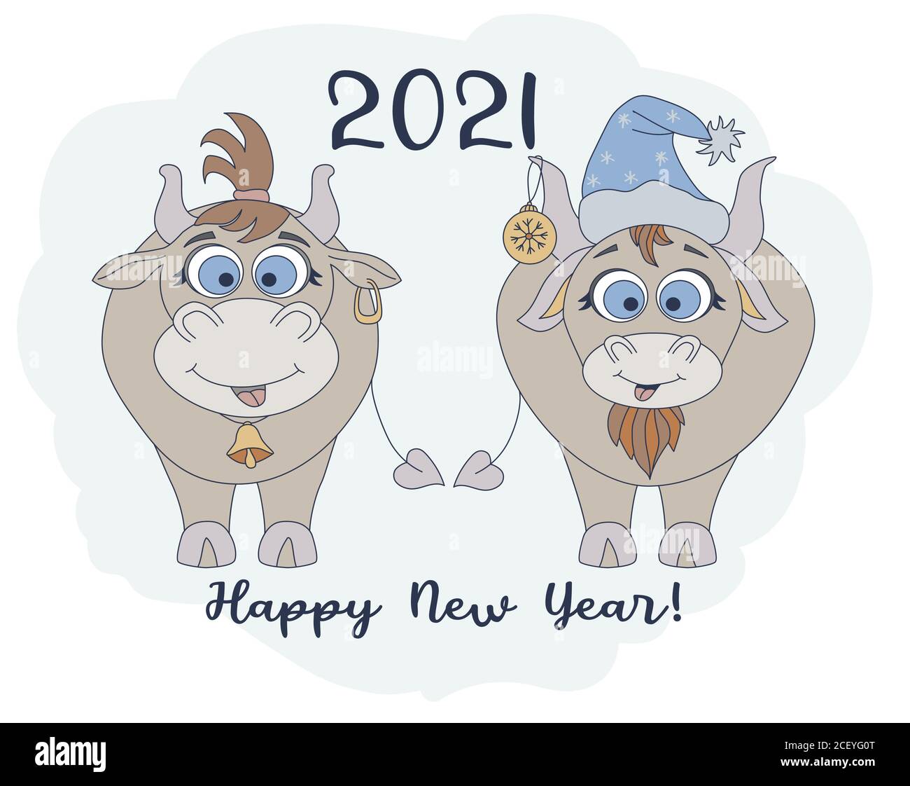 Anno Del Toro 2021 Personaggi Divertenti Un Toro Carino In Un Cappello Di Capodanno E Una Mucca Divertente Con Un Taglio Di Capelli Carta Di Capodanno E Auguri Di Buon Anno Immagine