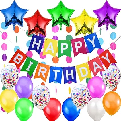 Jonami Decorazione Festa Di Compleanno Bandierine Di Buon Compleanno Happy Birthday 5 Palloncini A Stella 2 Festoni Arcobaleno Di 3 M 12 Palloncini Multicolore E Coriandoli Amazon It Casa E Cucina