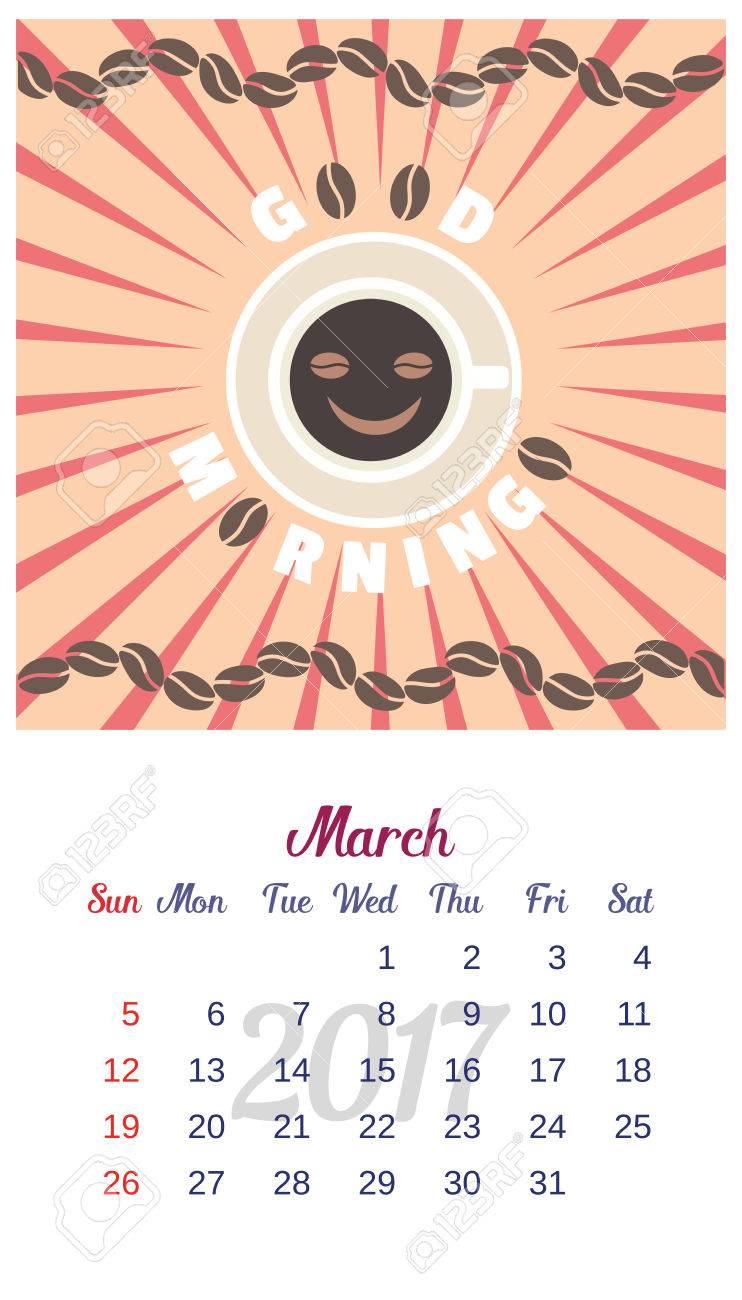 Vettoriale Calendario 2017 Modello Del Calendario Di Marzo Buongiorno Tema Con Tazza Di Caffe E Fagioli Idea Di Design Per La Pubblicita La Settimana Inizia Domenica Facile Da Modificare Illustrazione Vettoriale Image 61581822