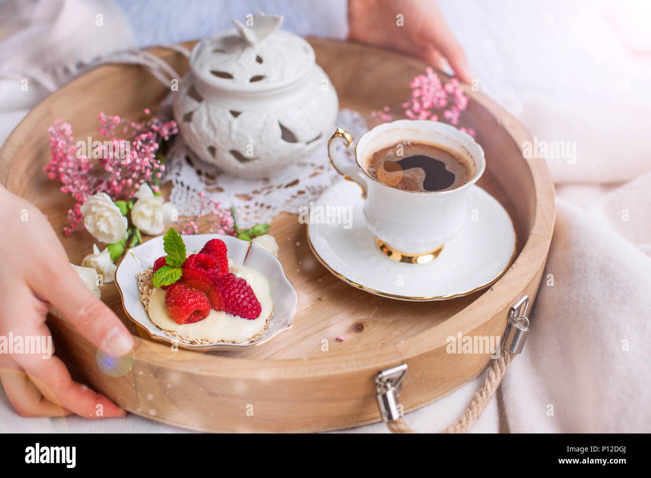 Una Donna E Di Bere Il Caffe A Letto Un Vassoio Di Legno Con Prima Colazione Bacche Di Lampone E Fiori I Colori Chiari Il Romance Buon Giorno Foto Stock Alamy