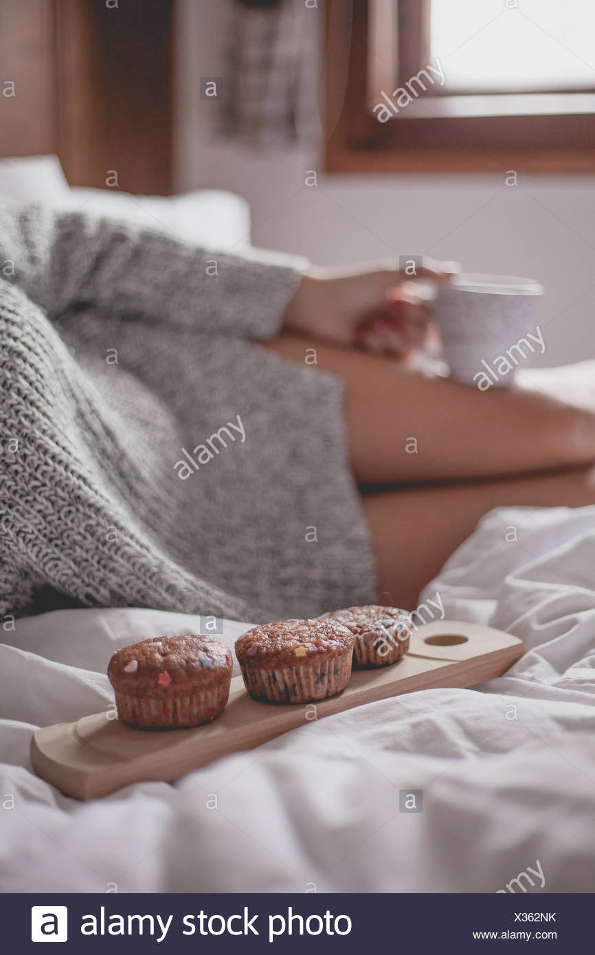 Donna Seduta Sul Letto Con La Tazza Di Te E Caffe E Muffin Foto Stock Alamy