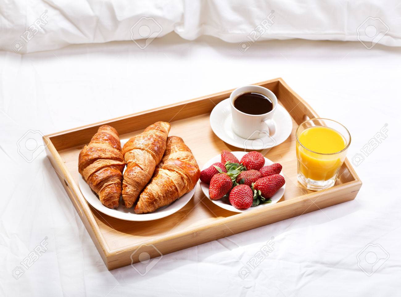Immagini Stock Colazione A Letto Con Caffe Cornetti Fragole E Succo Di Frutta Image 38200152