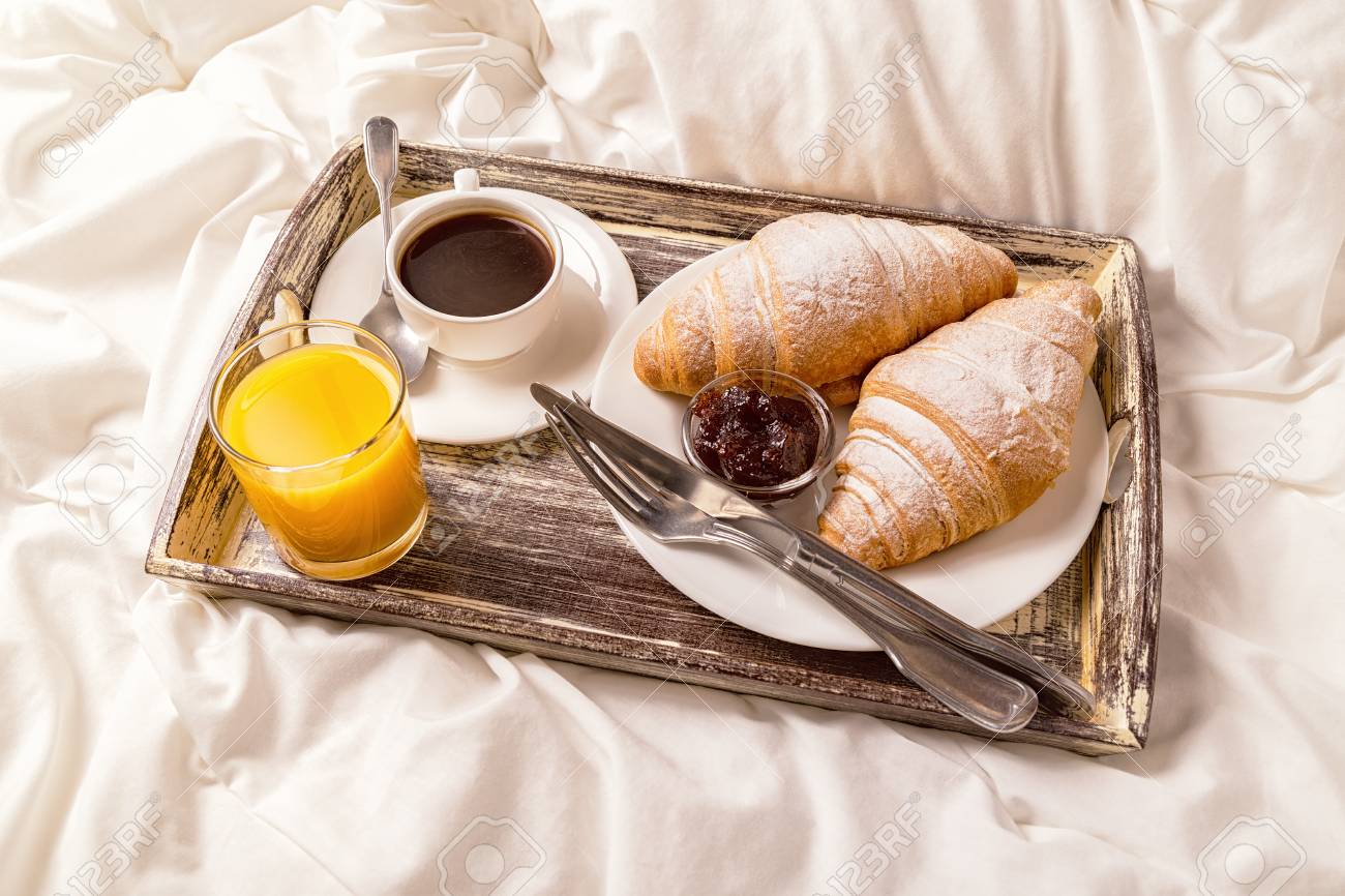 Vassoio Per La Colazione Con Tazza Di Caffe E Croissant A Letto Dessert Cibo Stock Photo 167692962
