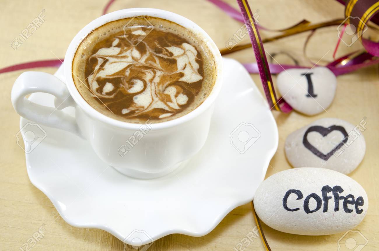 Immagini Stock Bianco Tazza Di Caffe Con Schiuma E Decorato Rocce Dire Amo Il Caffe Image 38935139