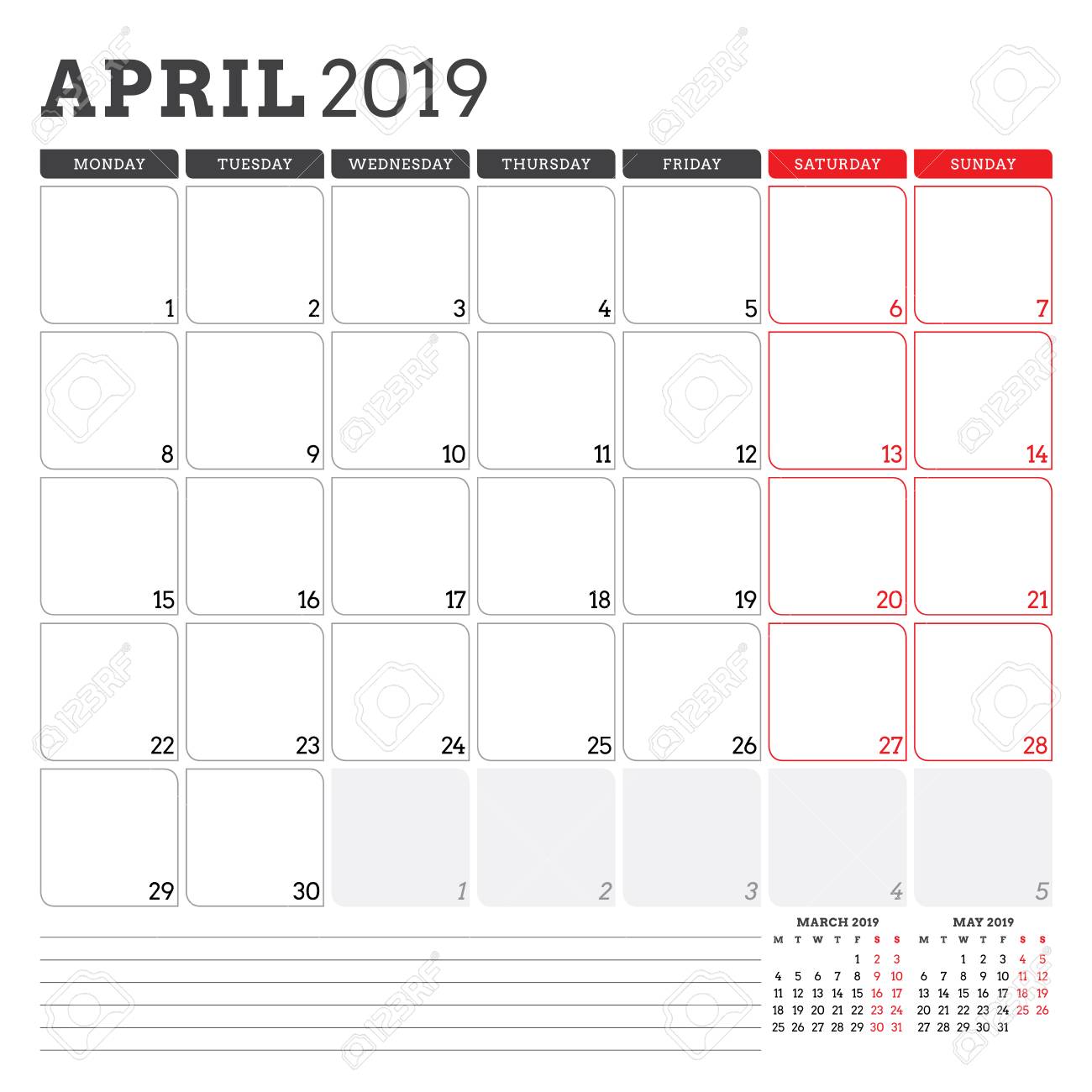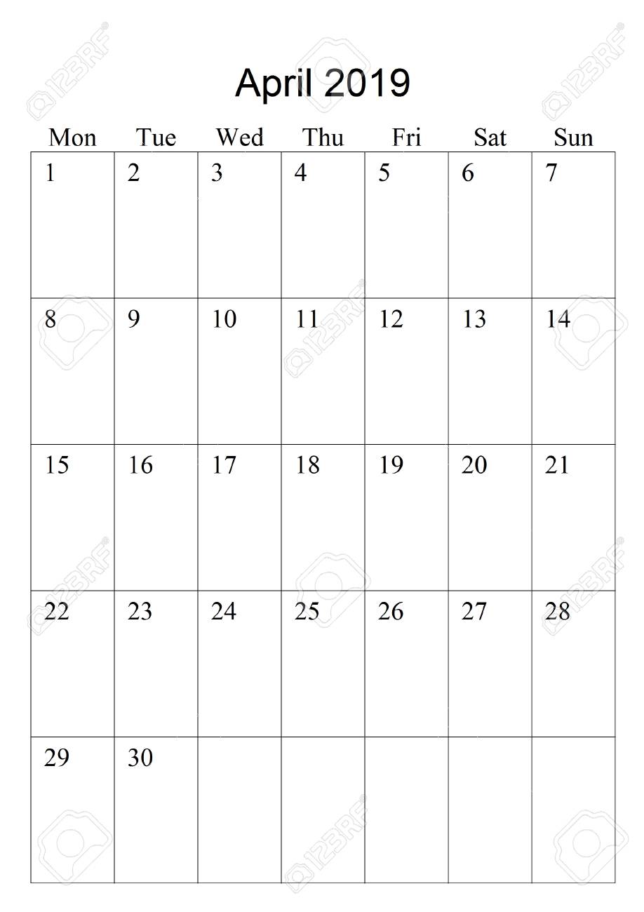 Vettoriale Pianificatore Di Calendario Per Aprile 2019 La Settimana Inizia Di Lunedi Modello Di Progettazione Di Articoli Di Cancelleria Stampabile Di Vettore Image 97863811