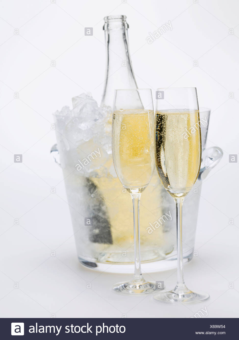 Due Bicchieri Di Vino Spumante Bottiglia Di Vino Nel Secchiello Per Il Ghiaccio Foto Stock Alamy