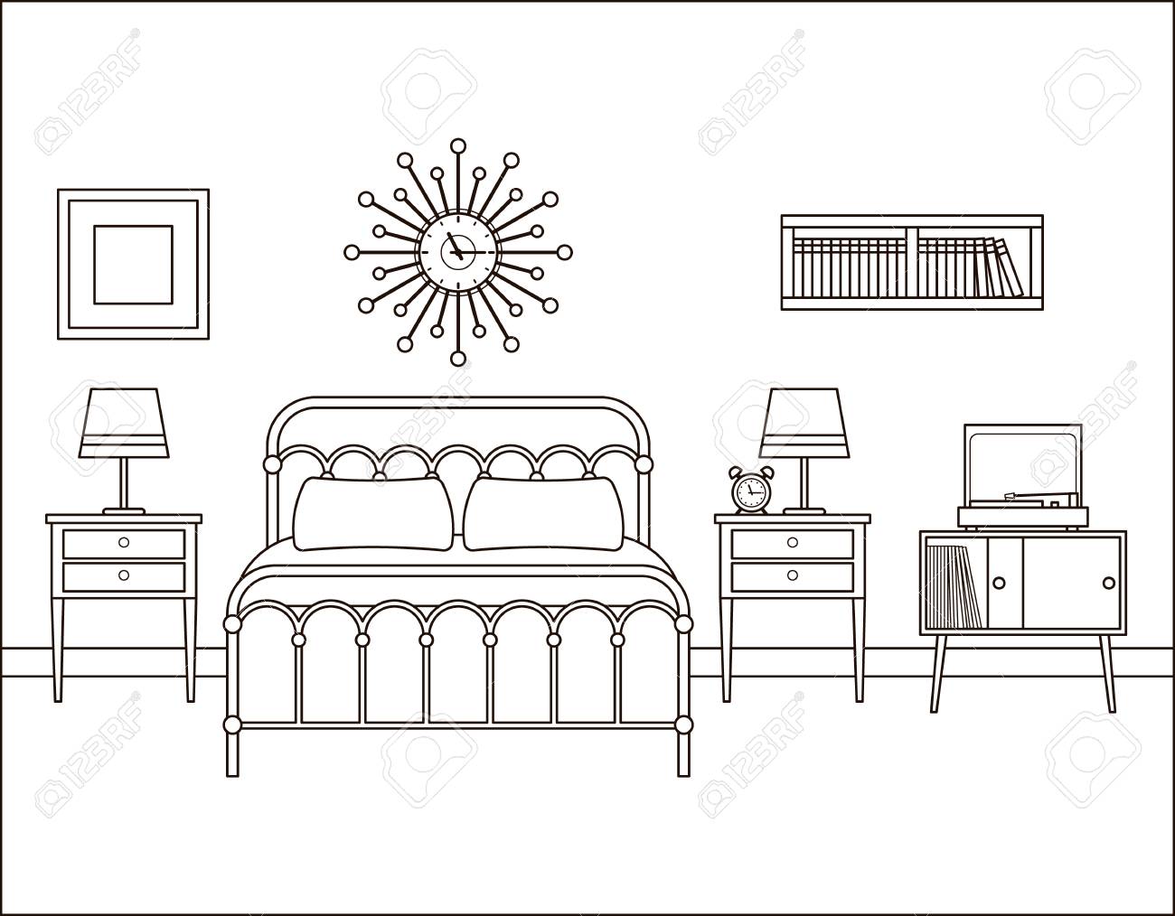 Vettoriale Interno Camera Da Letto Camera Retro In Hotel Con Letto Vettore Spazio Domestico In Linea Arte Design Piatto Della Casa Illustrazione Di Contorno Pagina Da Colorare Schizzo Bianco Nero Appartamento