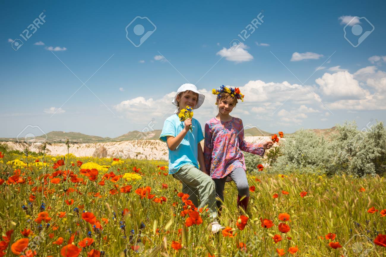 Immagini Stock Due Ragazze Felici Nel Campo Fiorito Estivo All Aperto Image 68842807