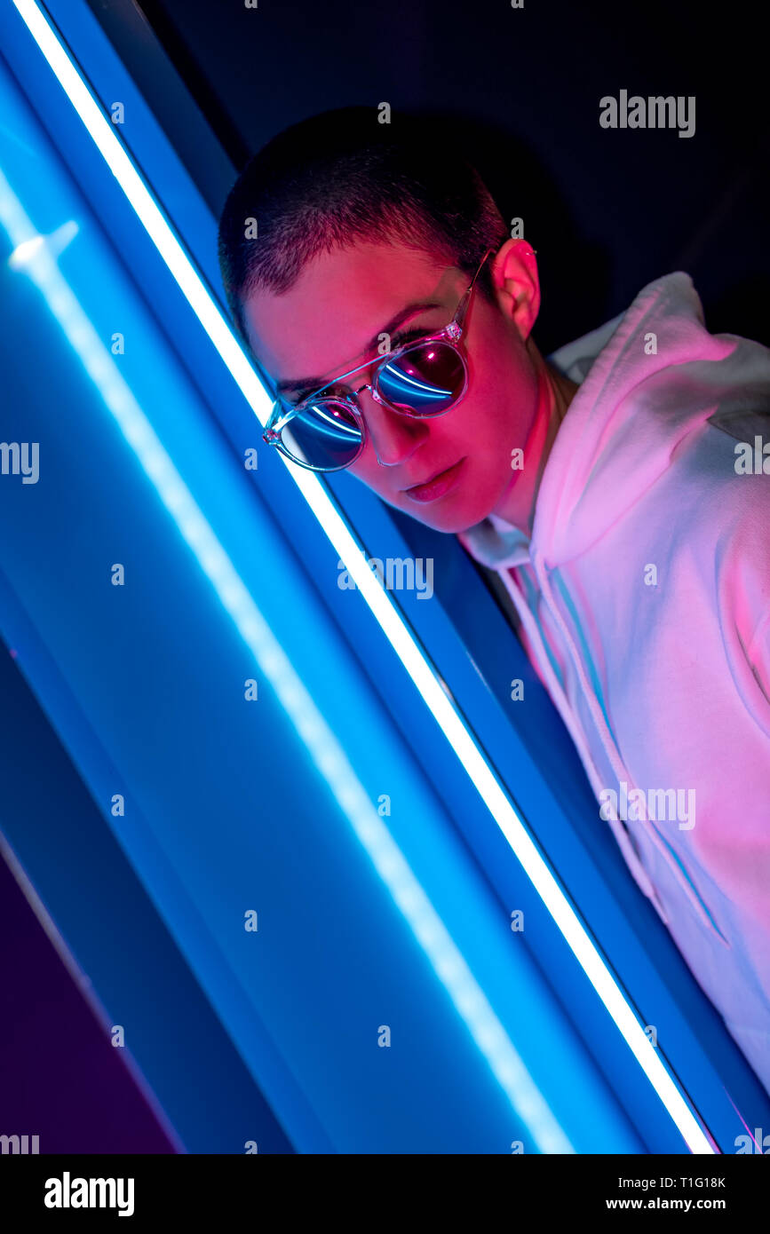 Colorato Ritratto Di Una Giovane Dai Capelli Corti Donna Che Indossa Gli Occhiali Da Sole Brillante E In Piedi Di Luci Al Neon Foto Stock Alamy