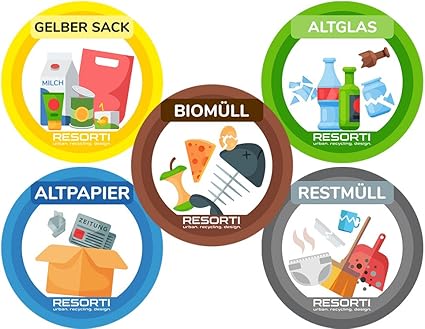 Resorti Set Di 5 Adesivi Per La Raccolta Differenziata Dei Rifiuti Con Simboli Adatti Ai Bambini Rifiuti Sacchi Gialli Rifiuti Organici Vetro Rifiuti Di Carta Amazon It Casa E Cucina