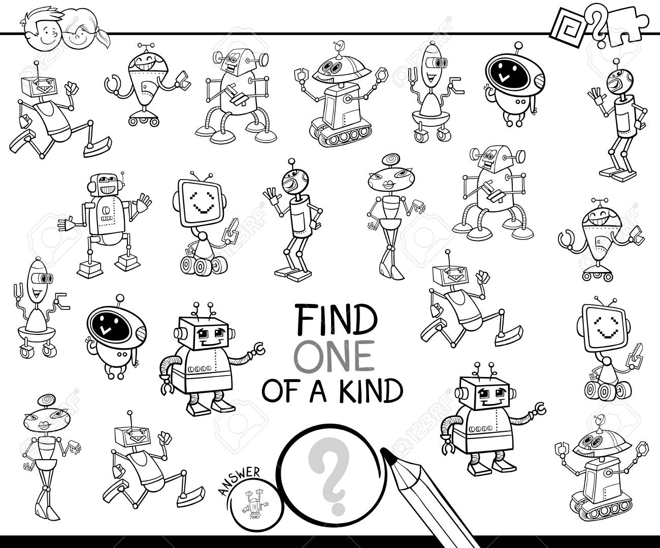 Vettoriale Illustrazione Di Cartone Animato In Bianco E Nero Di Trovare Uno Di Un Gioco Di Attivita Rducational Tipo Per Bambini Con Robot Personaggi Dei Cartoni Animati Da Colorare Image 90040286