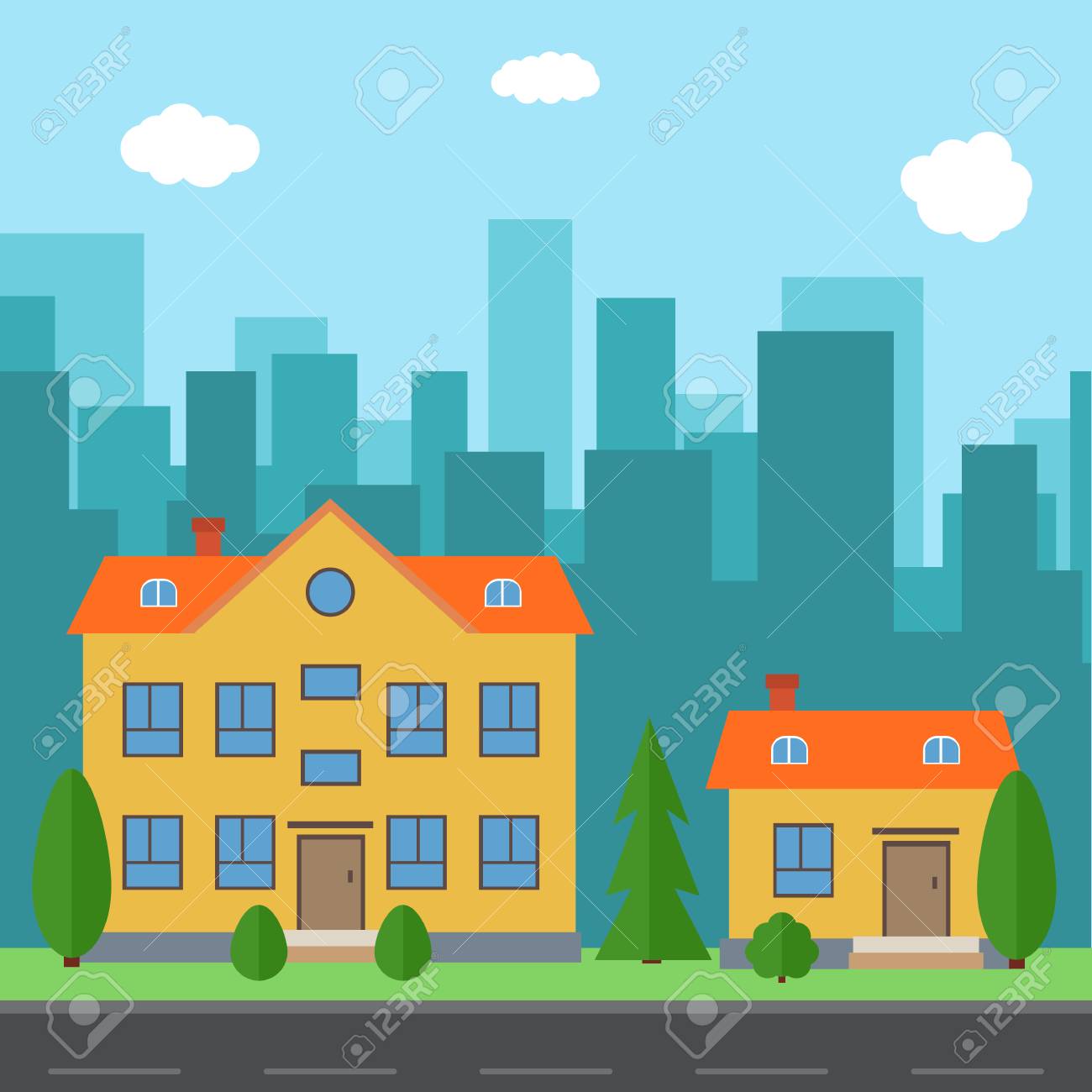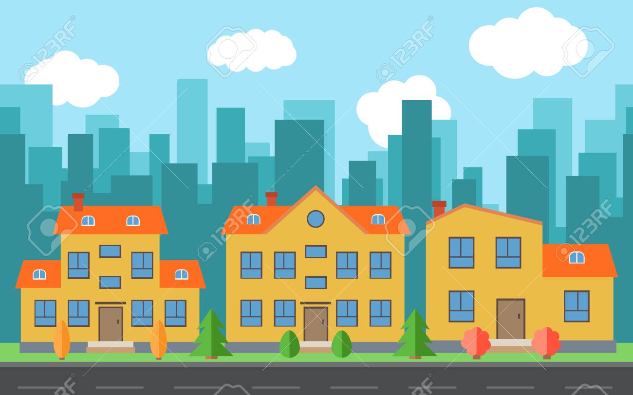 Vettoriale Vector Citta Con Le Case Dei Cartoni Animati E Gli Edifici Lo Spazio Della Citta Con La Strada Sulla Sfondo Stile Piatto Concetto Estate Del Paesaggio Urbano Via Vista Con