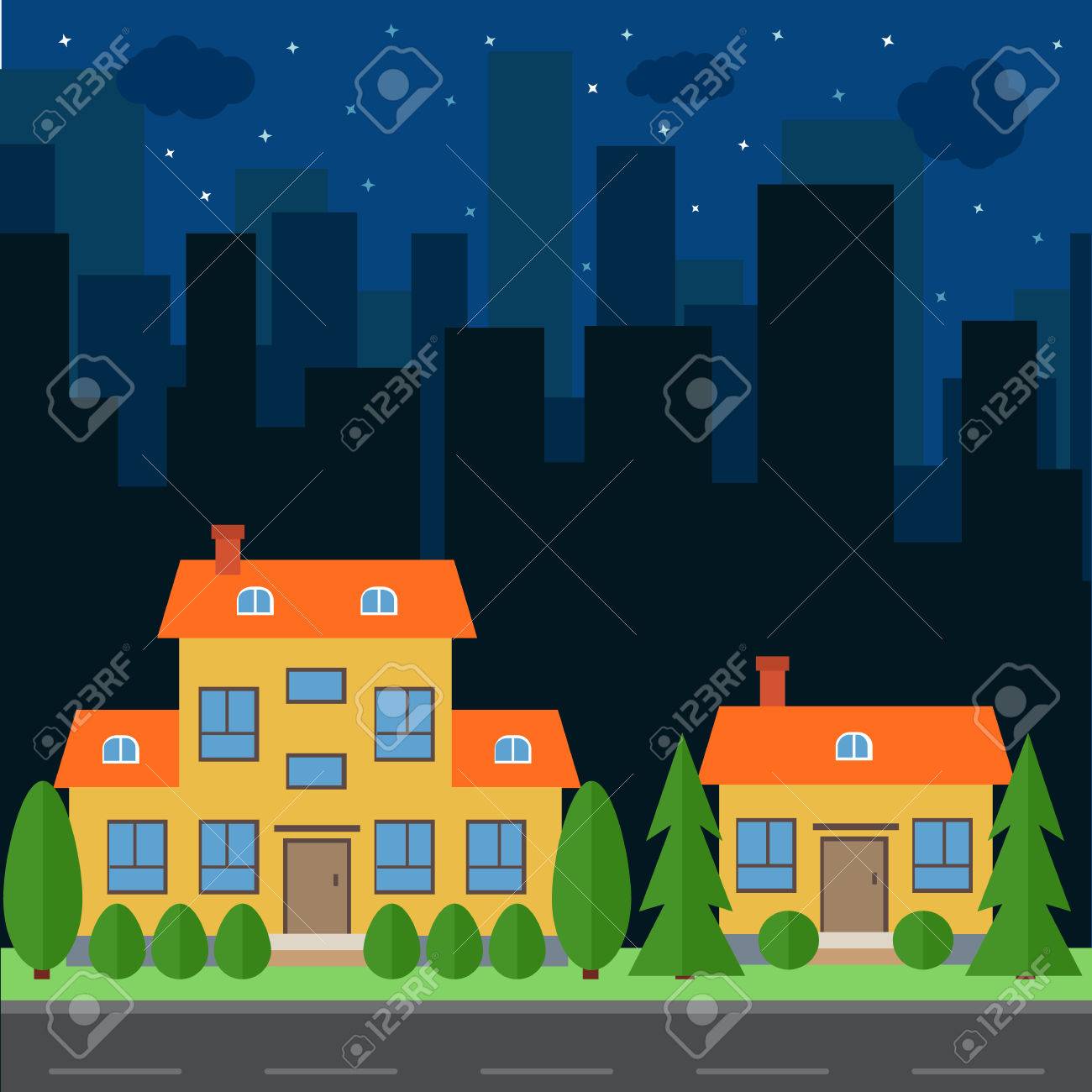 Vettoriale Vector Citta Di Notte Con Le Case Dei Cartoni Animati E Gli Edifici Lo Spazio Della Citta Con La Strada Sulla Sfondo Stile Piatto Concetto Estate Del Paesaggio Urbano Via
