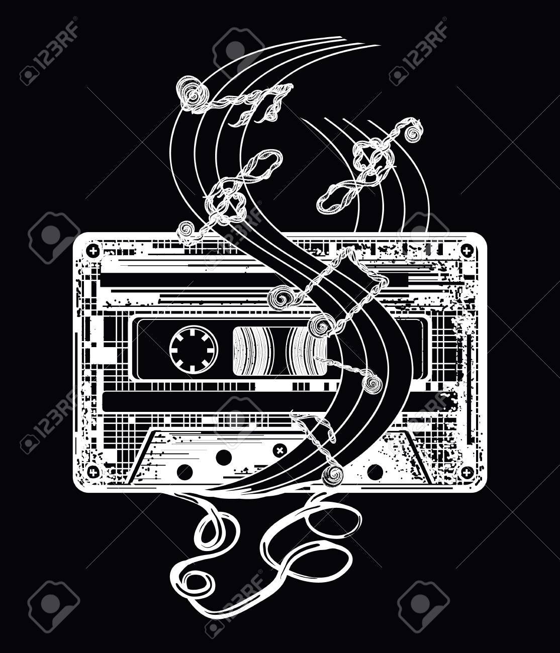 Vettoriale Audio Cassetta E Note Musicali Tatuaggio E T Shirt Design Simbolo Di Musica Retro Nostalgia 80 E 90 Vecchie Cassette Audio E Note Musicali Simbolo Della Musica Pop Dischi