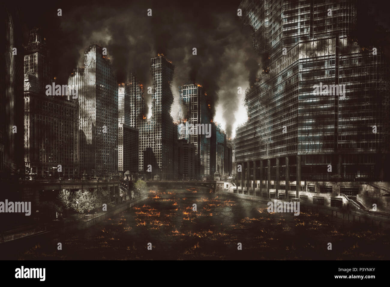 Lugubre Scena Notturna Delle Conseguenze Di Un Esplosione O Un Incendio Catastrofiche Nel Cbd Di Una Citta Moderna Con Fumo E Detriti Di Masterizzazione Foto Stock Alamy