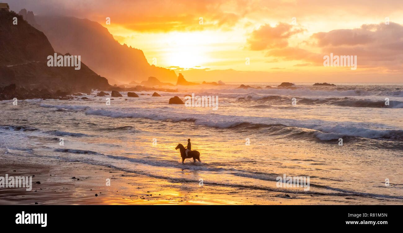 Uomo A Cavallo Sulla Spiaggia Al Tramonto Persona Con Cavallo Al Mare Vista Posteriore Con Belle Retroilluminazione Sport Tempo Libero E Viaggi Concetti Foto Stock Alamy