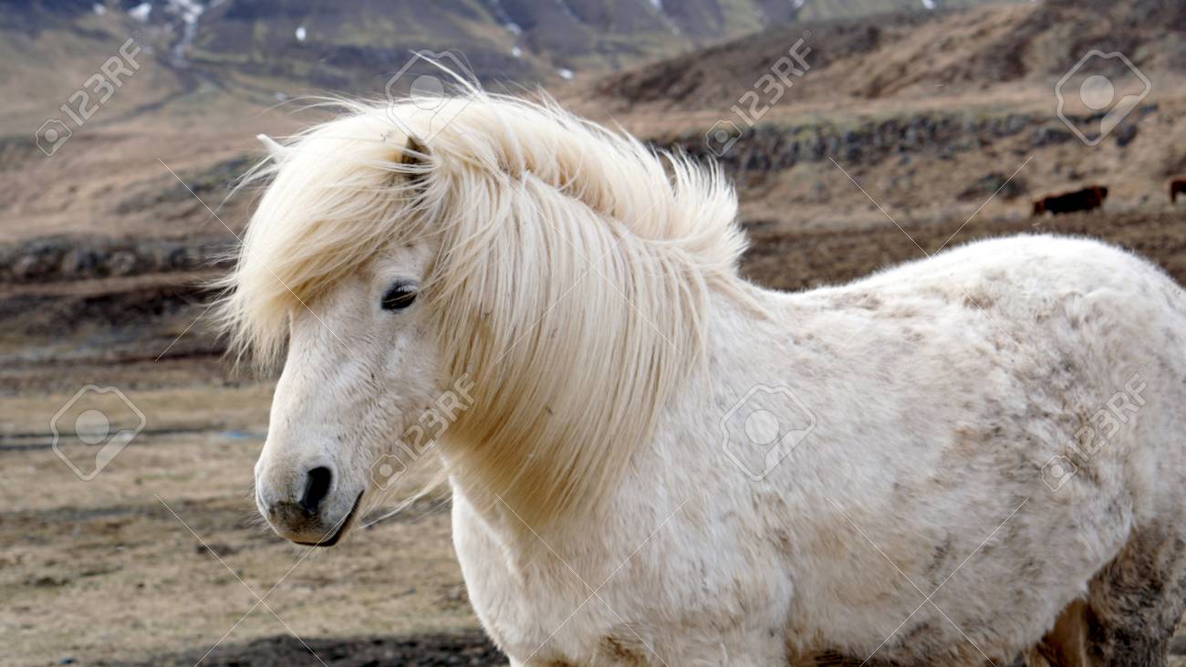 Immagini Stock Bellissimo Ritratto Di Cavallo Islandese Bianco Criniera Del Cavallo Che Si Muove Dal Forte Vento Image 77501207
