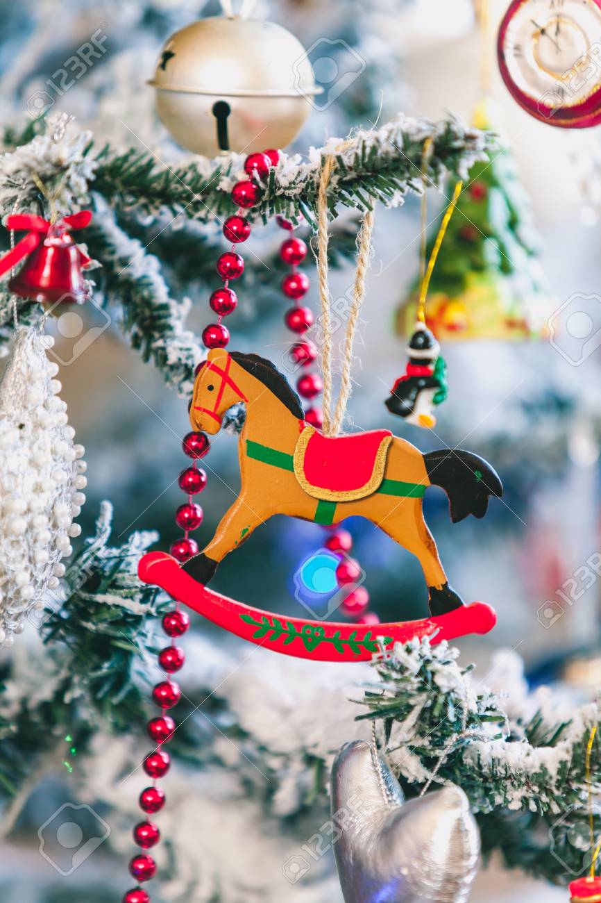 Immagini Stock Il Giocattolo Originale Per Albero Di Natale E Una Statuetta In Legno Di Un Cavallo Che Pesa Su Un Albero Di Capodanno Intorno Alla Ghirlanda Rossa Image 91546165