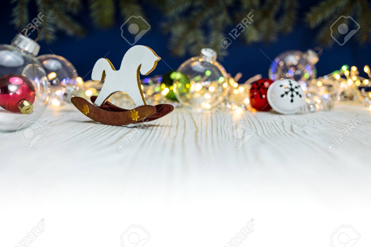 Immagini Stock Giocattolo Di Legno Del Cavallo E Sfere Di Vetro Di Natale Su Priorita Bassa Vaga Con Rami Di Abete E Luci Natalizie Image 91088848