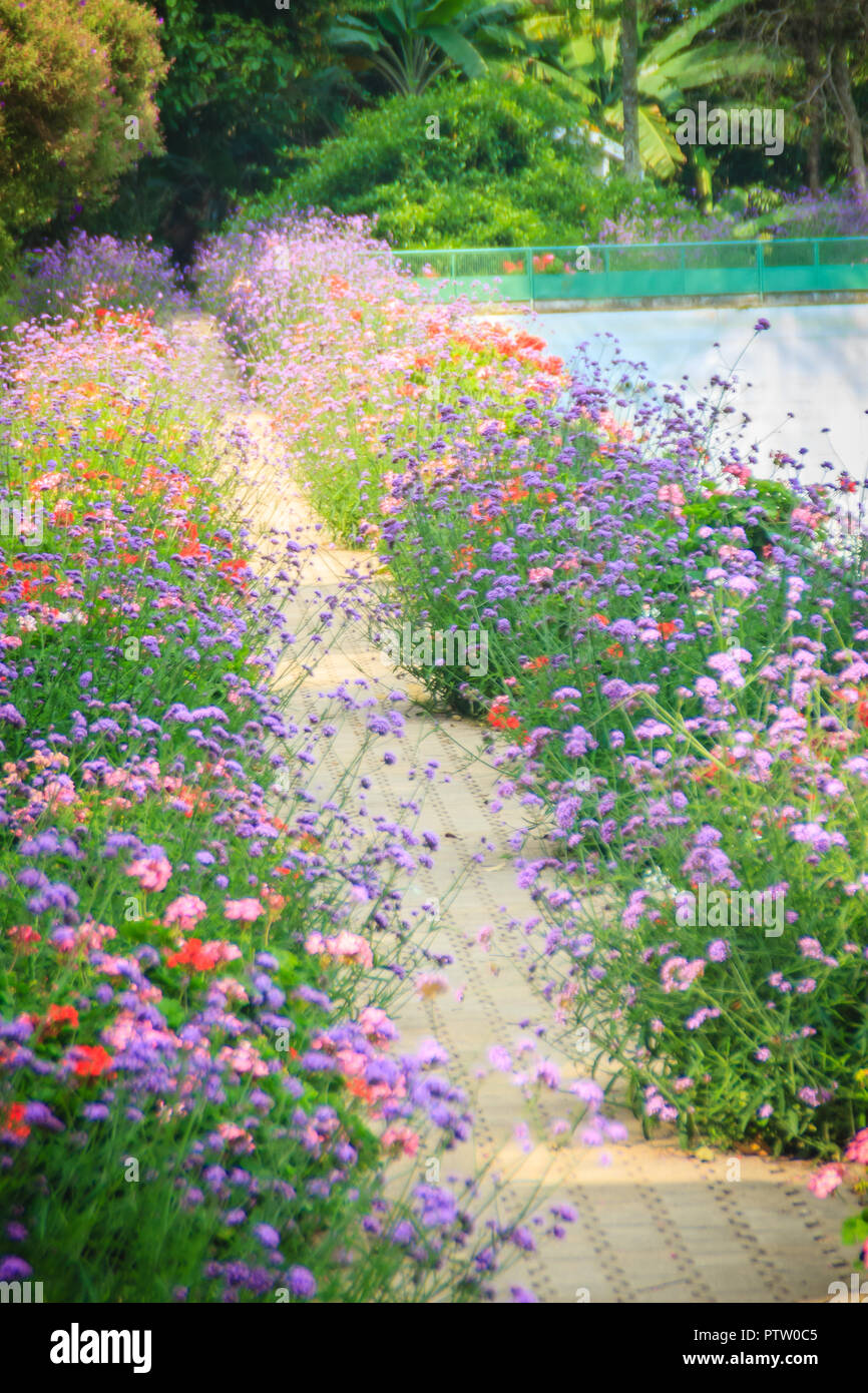 Pavimentazione In Pietra Con Righe Viola Di Verbena Cespugli Fioriti Nel Giardino Fiorito Rosso E Fiori Viola Percorso Per Lo Sfondo Foto Stock Alamy
