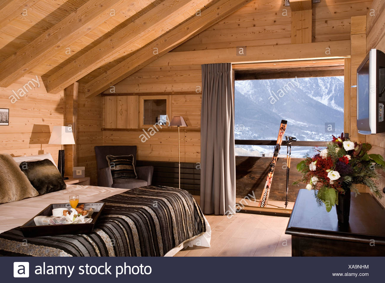 Alpine Chalet Bedroom With View Of The Mountains Through Open Glass Doors Stock Photo Alamy