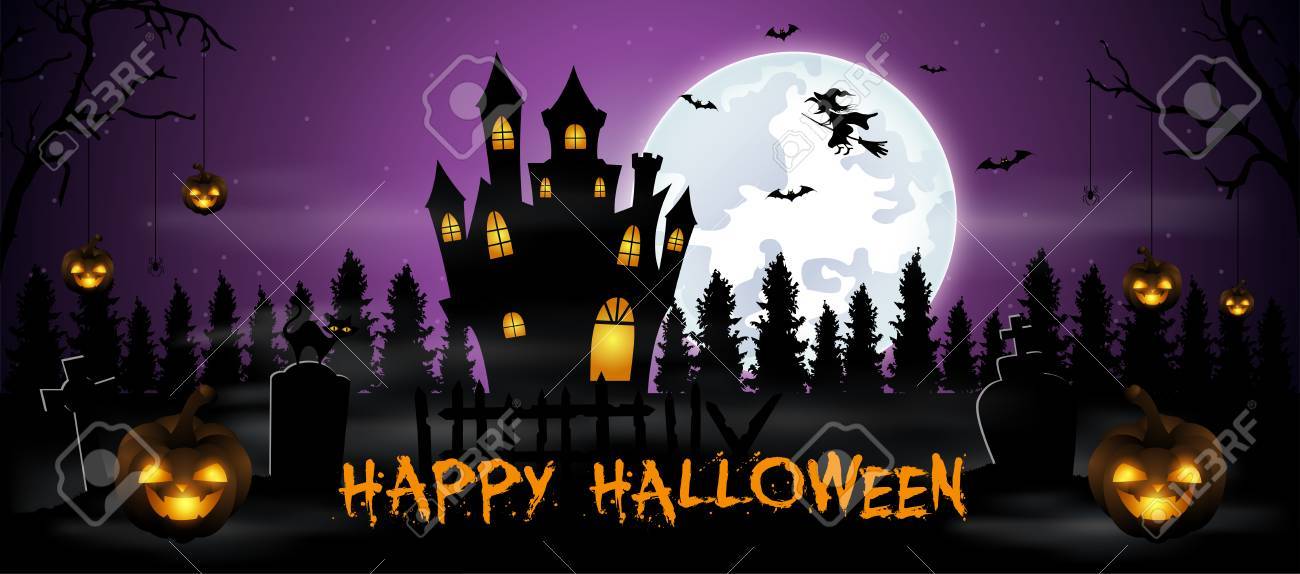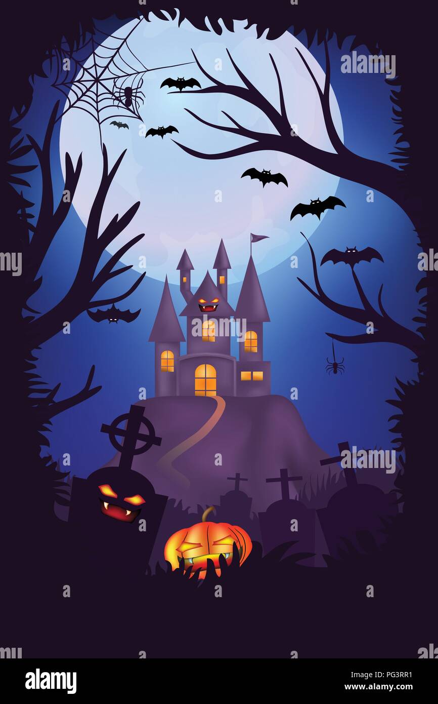 Happy Halloween Night Poster Design Creepy Cimitero I Cimiteri Con Zucche Scary Castle E Luna Piena Sfondo Con Telaio Ad Albero La Notte Di Halloween Immagine E Vettoriale Alamy