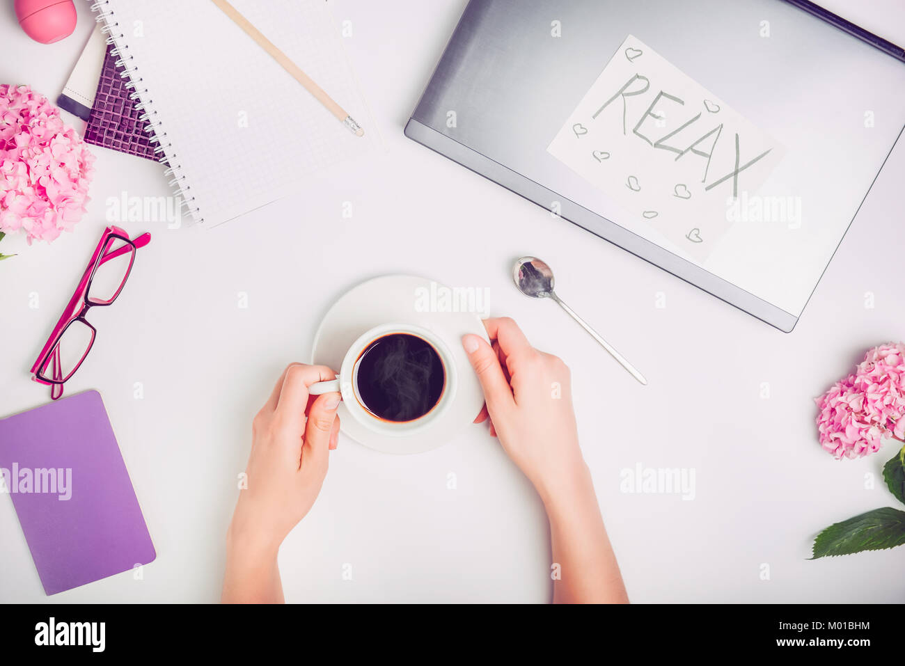 Coffee Break Time On The Workspace Female Hands With Cup Of Coffee Stock Photo Alamy