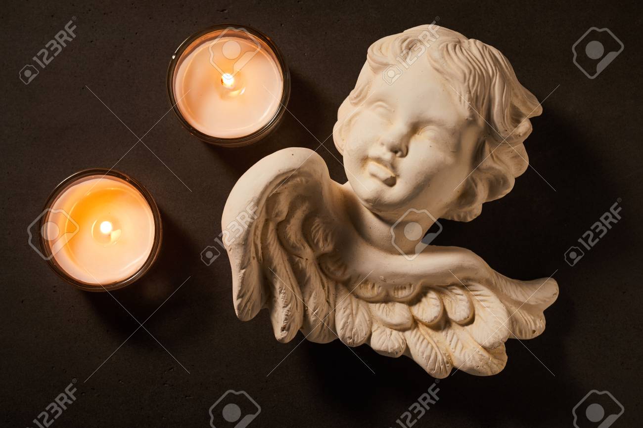 Immagini Stock Angelo Di Cherubino Con Candele Accese Su Uno Sfondo Scuro Concettuale Di Spiritualita Dolore Lutto E Lutto Image 93951961