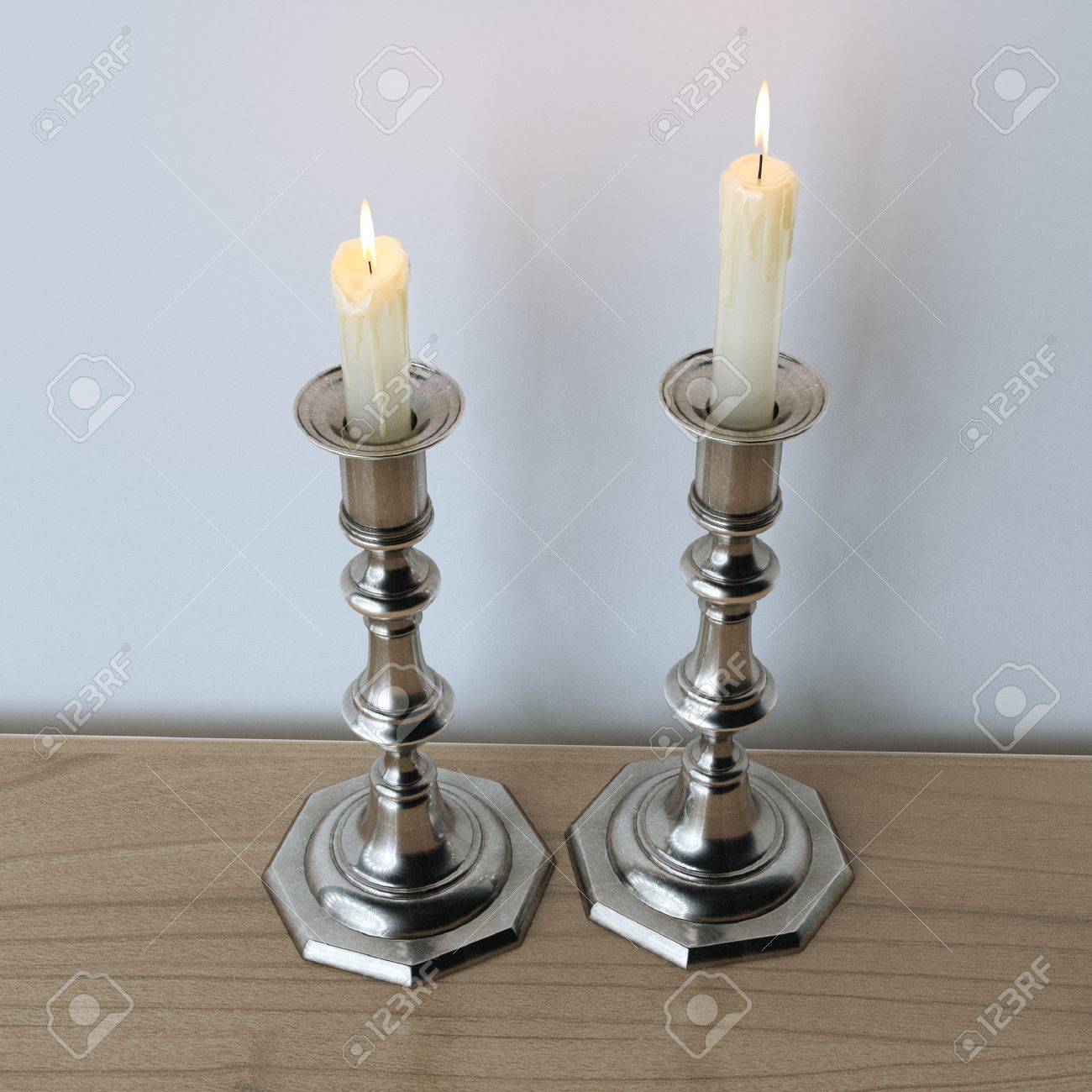 Immagini Stock Candelabri Retro Con Candele Accese Su Superficie Di Legno Image 40310815