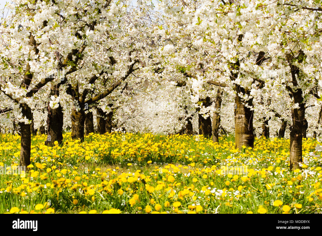 Molti I Meli In Fiore In Fila Sul Campo Con Fiori Di Primavera Foto Stock Alamy