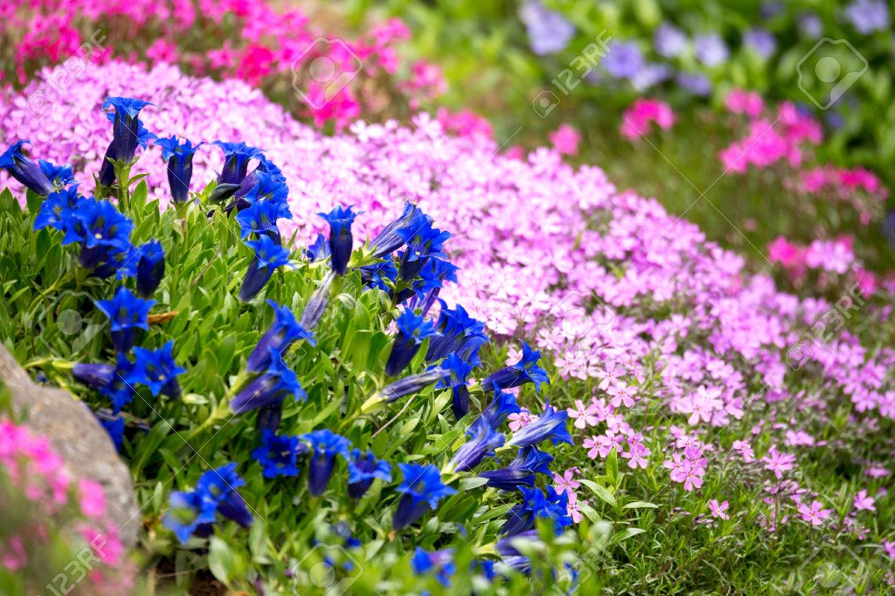 Immagini Stock Genziana Della Tromba Fiore Di Primavera Blu In Giardino Con Fiori Rosa In Background Priorita Bassa Della Sorgente Fiore Primaverile Sfondo Naturale Srping Giardino In Fiore Image 57195509