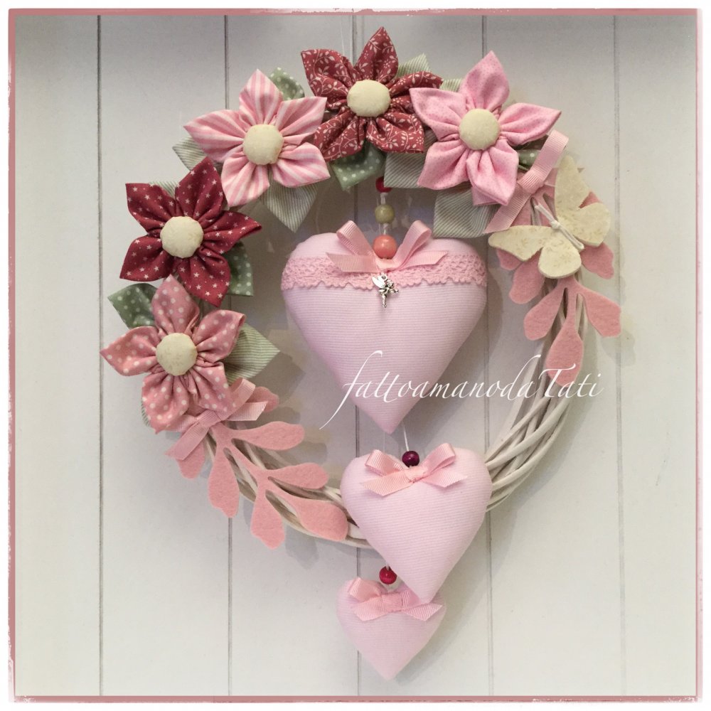 Fiocco Nascita Primavera In Vimini Con Fiori E Cuori In Cotone Sui Toni Del Rosa