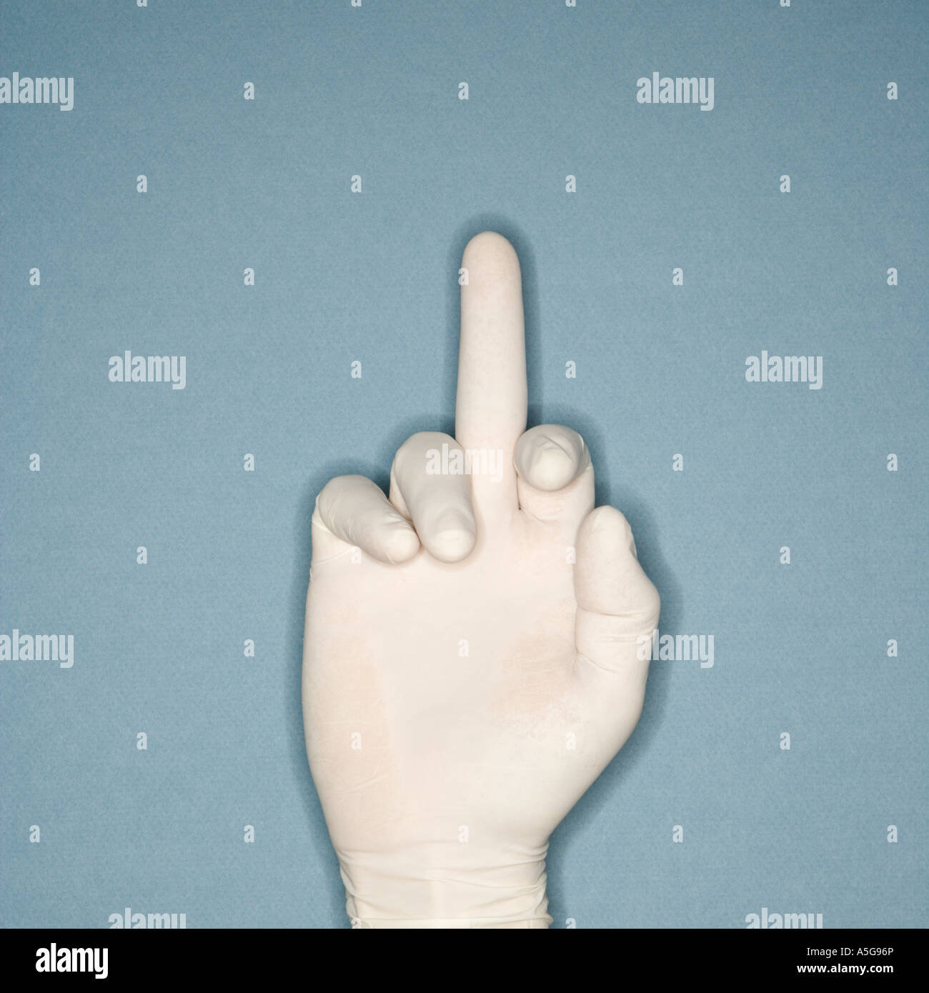 Mano Bianca Da Indossare Guanti Di Gomma Con Il Dito Medio Esteso Rendendo Gesto Profano Foto Stock Alamy