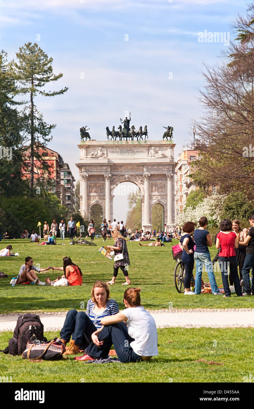 Le Persone Che Si Godono Il Sole Al Parco Sempione Con Arco Della Pace In Background Foto Stock Alamy