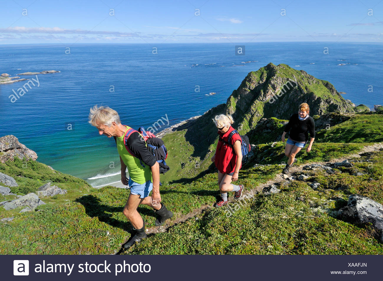 Tre Persone Con Zaini Trekking Sul Paesaggio Di Montagna Dal Tranquillo Mare Blu In Norvegia Foto Stock Alamy