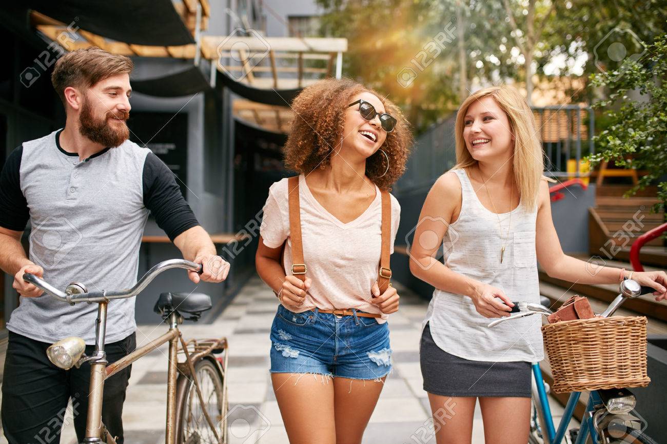 Immagini Stock Felice Giovani Persone Che Camminano Per La Strada Della Citta Con Le Loro Biciclette E Sorridente Giovane E Donne Sulla Strada Con Le Loro Moto Image 48982127