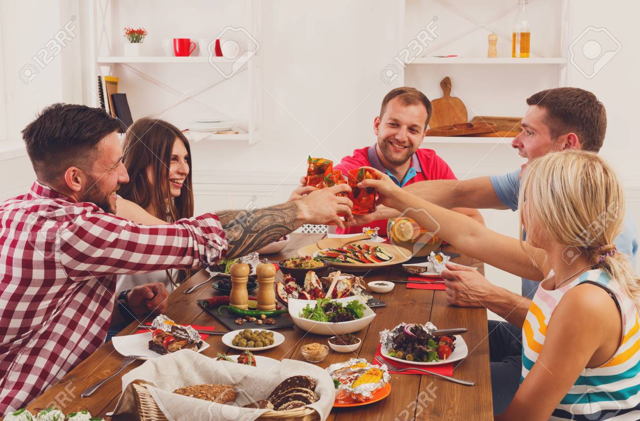 Immagini Stock Gruppo Di Persone Che Brindisi Dicendo Applausi Mangiare Pasti Sani Alla Festa Tavola In Caffe Ristorante O In Casa Azienda Giovane Simpatici Amici Festeggiare Con Cibo Biologico Al Tavolo
