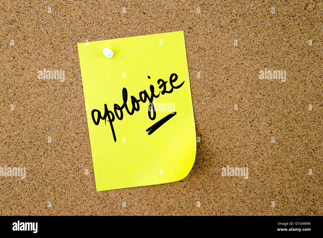 Scusa Scritta Su Carta Gialla Nota Appuntata Sulla Bacheca Di Sughero Con Il Bianco Thumbtacks Copia Dello Spazio Disponibile Foto Stock Alamy